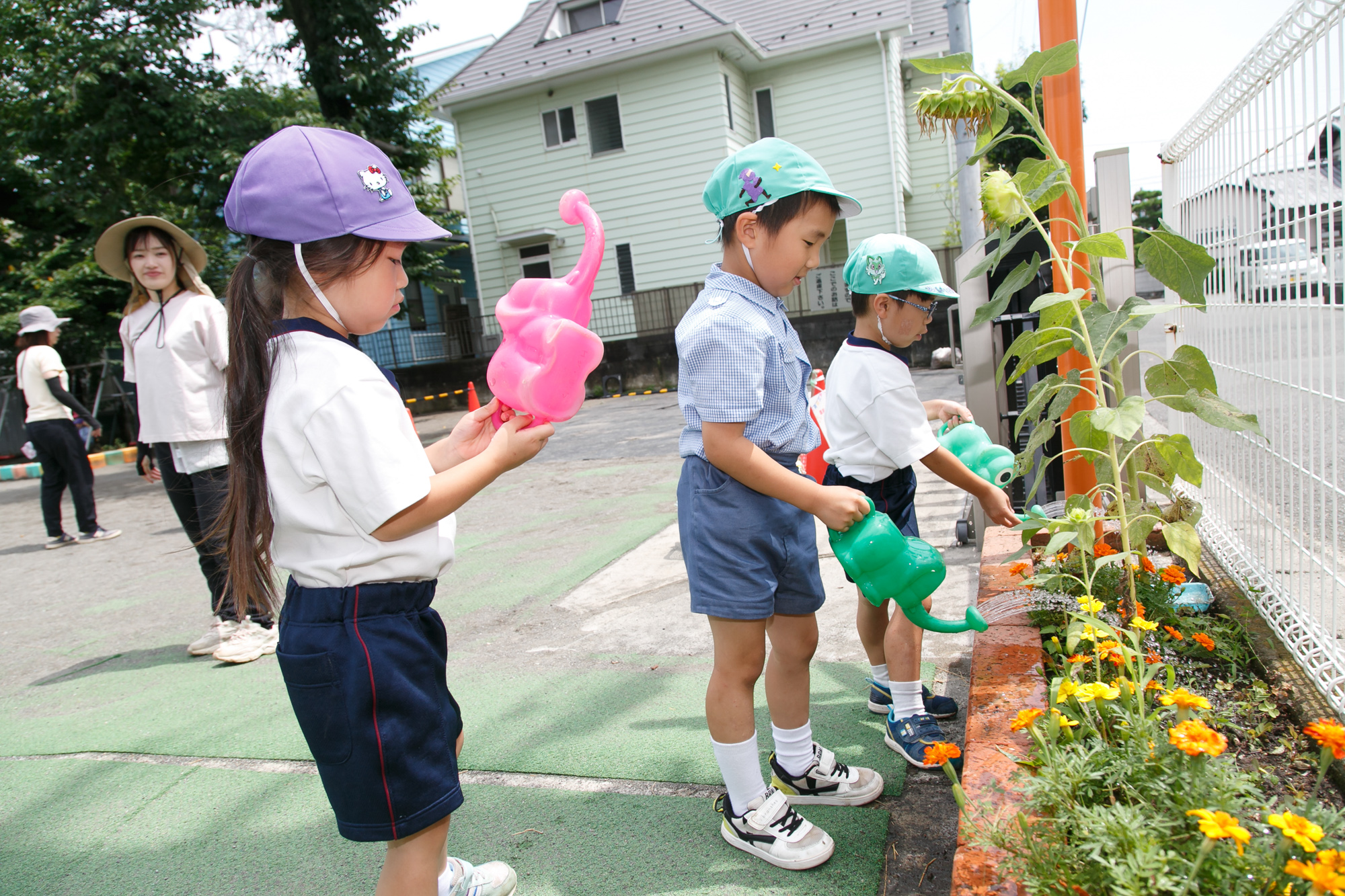 年長さんはトイレのペーパー確認・補充、生き物の餌やり、花への水やりなどの当番があります。