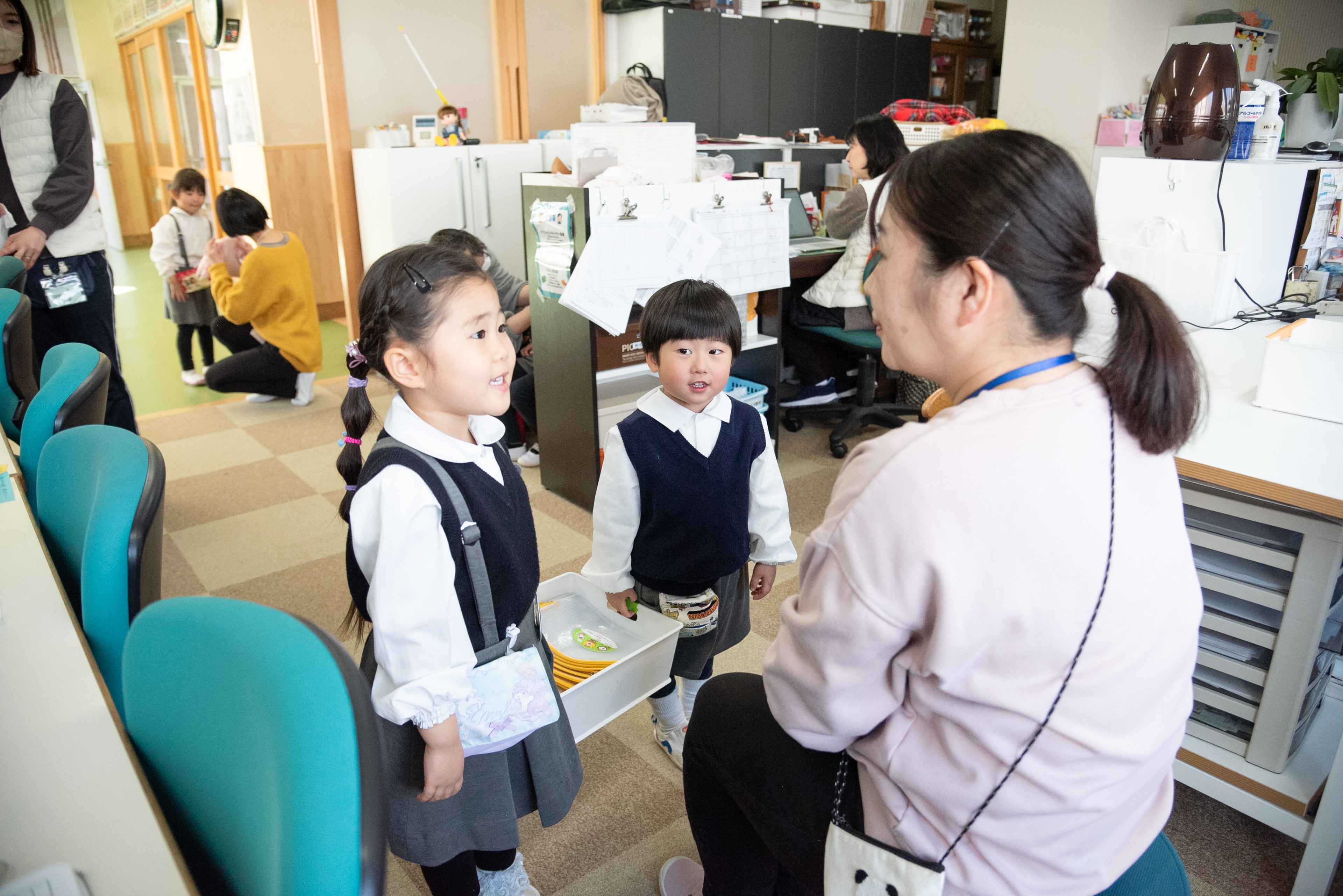 いちご組から年長までクラス当番があります。その日の欠席者などを報告しに、職員室にいきます。
