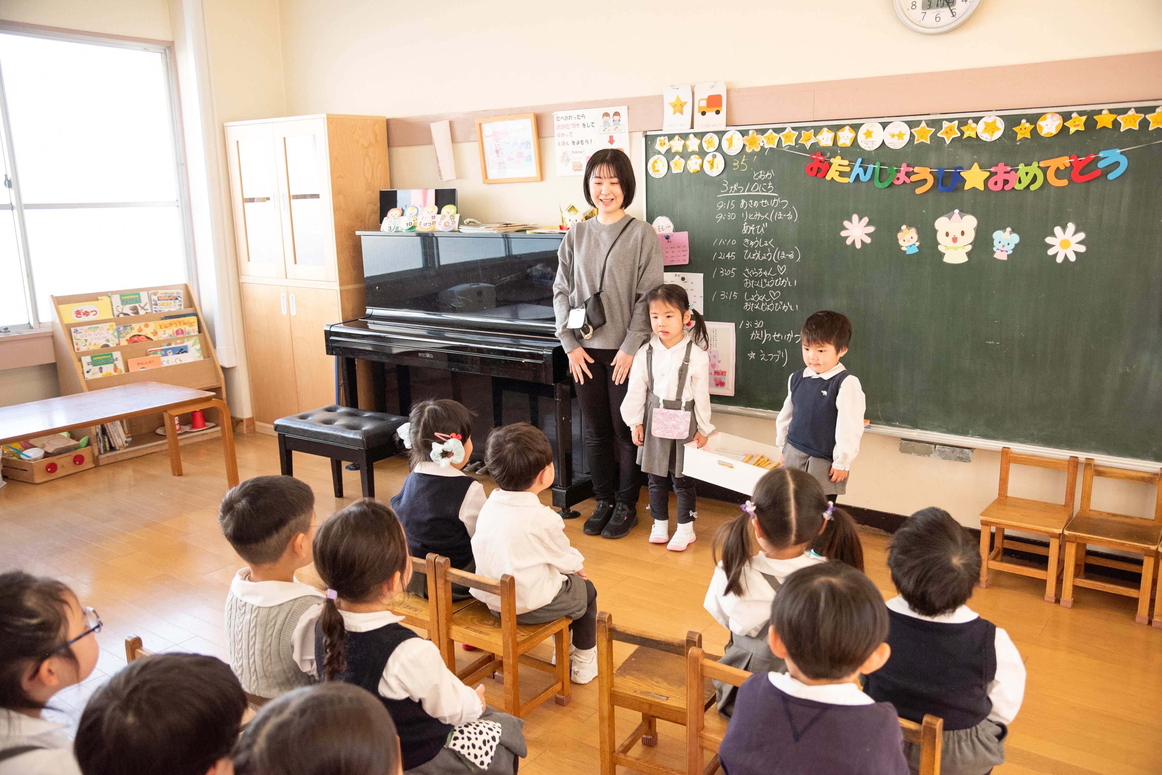 歌や合奏などをしたり、年長になるとボール取り、まりつき、バトンリレーなどにも取り組みます。