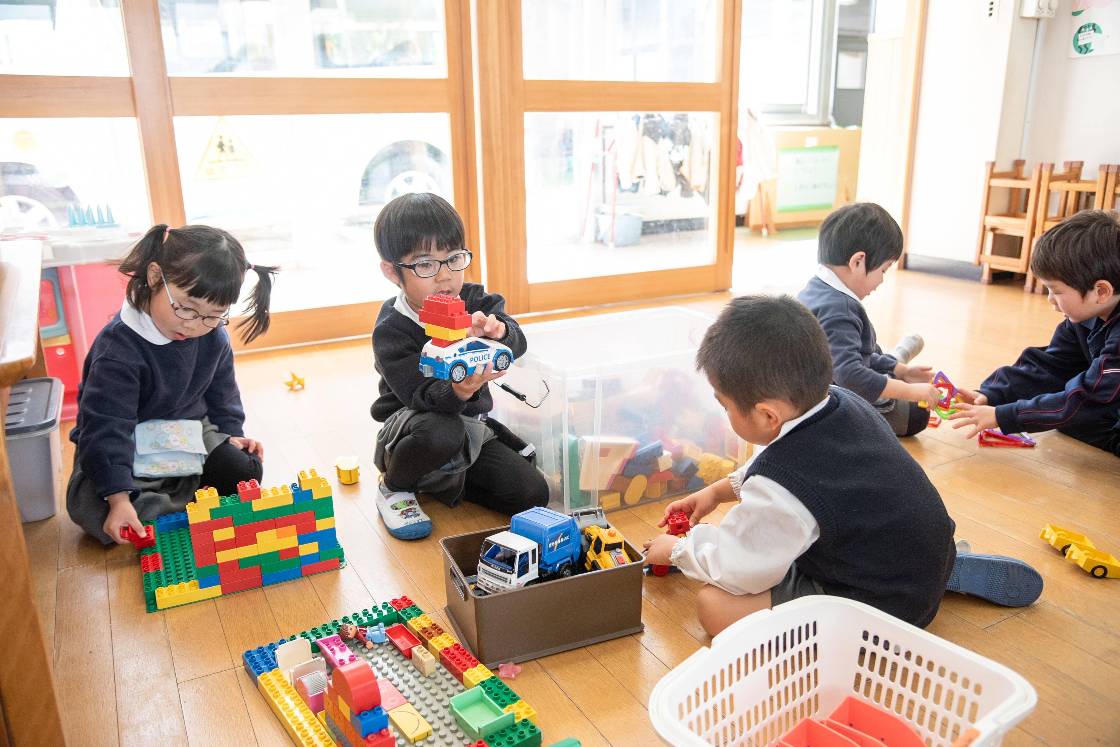 園庭やホールで身体を動かして遊んだり、教室で積木やブロック、製作などをします。